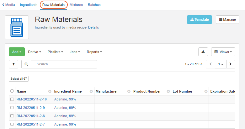 As for samples, you can create aliquots of Raw Materials, or use certain Raw Materials to create derived samples or pooled outputs. Select the desired parent material(s) and choose Derive > Aliquot Selected or Derive or Pool as desired.