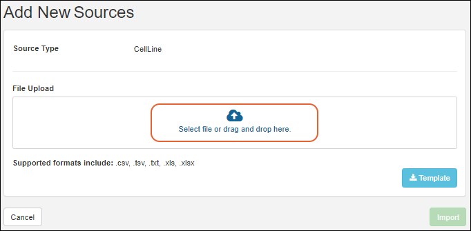 • Confirm that the Source Type you want is selected, then drag and drop your file into the target area and click Import.