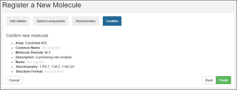 On the final tab, confirm the selections and click Finish to add the molecule to the registry.
