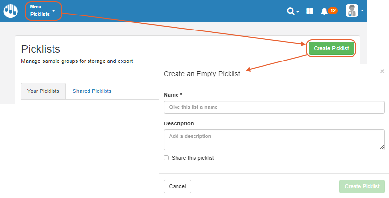 Picklists that facilitate operations on groups of samples such as adding or removing from a freezer, adding to a workflow job, or performing bulk operations. You can add samples to picklists from many places in the application, and create new ones as needed on the fly.