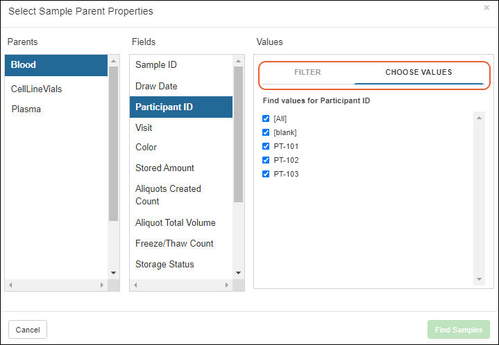 Improved experience when adding samples to storage - When adding samples to a storage location, the Search for Samples grid now automatically includes Identifying Fields, making it easier to locate the correct samples quickly. (docs)