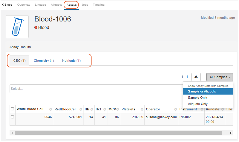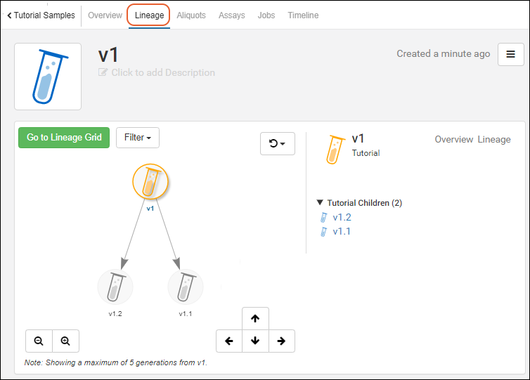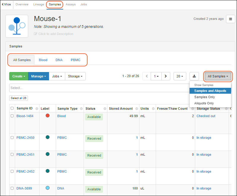 Lineage tab in the upper left to see the lineage of that particular sample. In our demo, DNA samples are derived from PBMC samples, which in turn were derived from blood samples, which in turn have several sources.