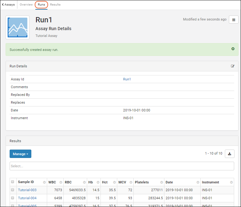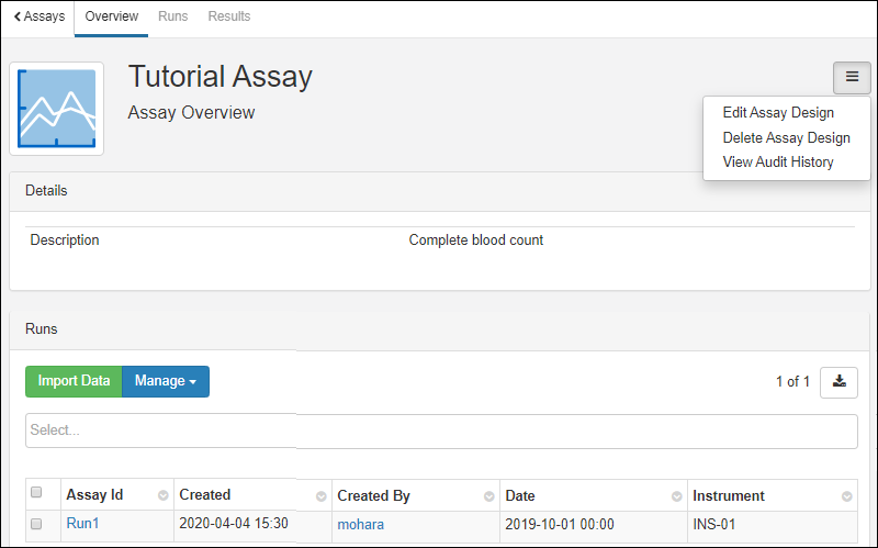 Assay ID (i.e. the name) of any run to see the data. Notice that all data is associated with a sample; in the case of the qPCR assay, you'll see a set of DNA samples. Click a