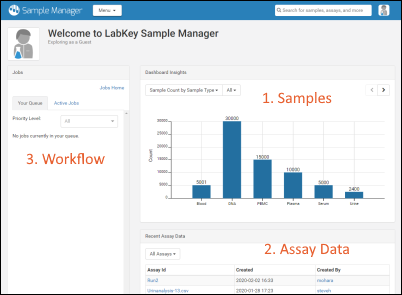 You are exploring the application as a guest and can immediately see there are 6 types of samples present, and some recent assay data. To return to this dashboard at any time, click the logo in the upper left. Let's click through three main areas of the application:
