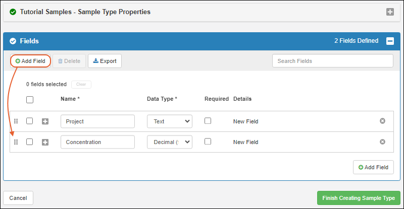 - Before you click Finish Creating Sample Type, review the next section and determine whether you need to add Fields.