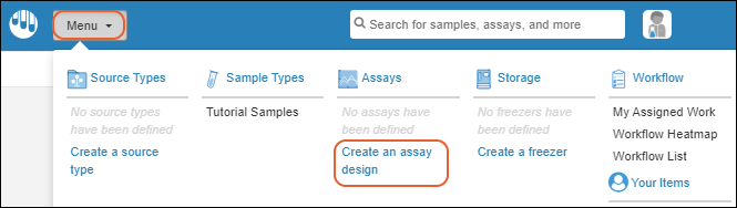 - If any assay designs have already been created, you will not see this link. In that case, click Assays and then select Create > Assay Design.