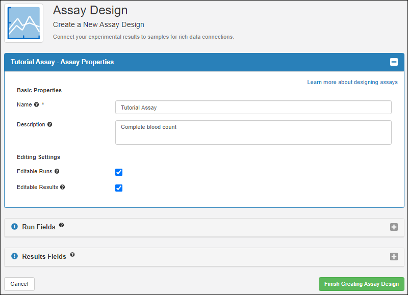 Assay Designs describe the structure of assay data you will gather for your samples. Similar to sample types, you define the properties and fields of your experiment data. Assay data will also be mapped to the sample that it is about. In this topic, we define a "Tutorial Assay" and import an example run of data for the