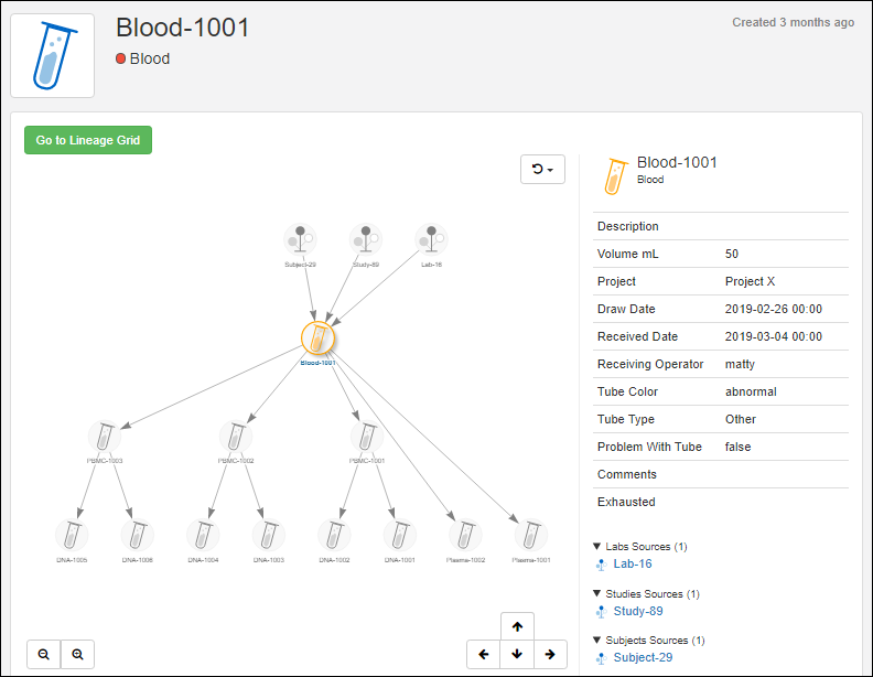 Click the Lineage tab in the upper left to see the lineage of that particular sample. In our demo, DNA samples are derived from PBMC samples, which in turn were derived from blood samples, which in turn have several sources.