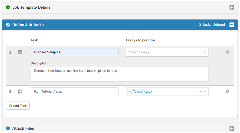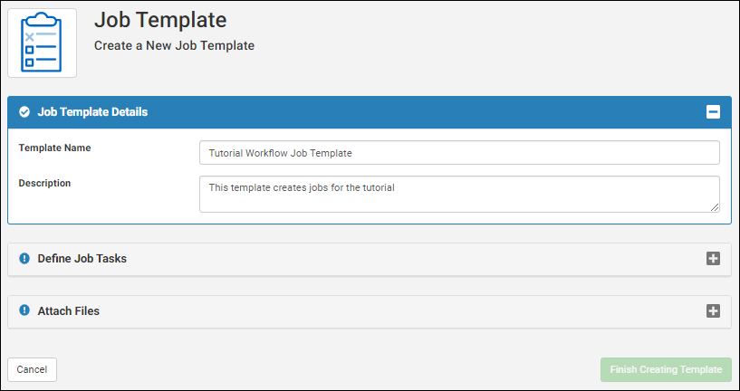 Click each section in the wizard to define template details and job tasks, and attach any files that should always be included when a job is created from this template.