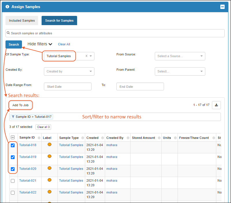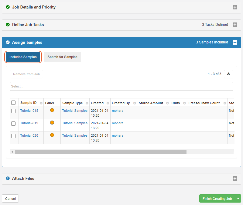 To start a job, you can either start by selecting the samples you want worked on, or add them to the job later. It's also possible to have jobs that do not involve samples, if that supports your lab workflow.