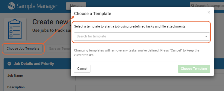 You can create a job from a template you have already saved, with or without the preselection of samples. Creating a job from a template follows the same wizard process, but the description, tasks, and other details are preconfigured.