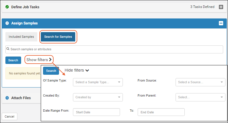 - If you did not start creating this job from a selection of samples, when you open the Assign Samples panel, click the Search for Samples tab (if it is not open by default).