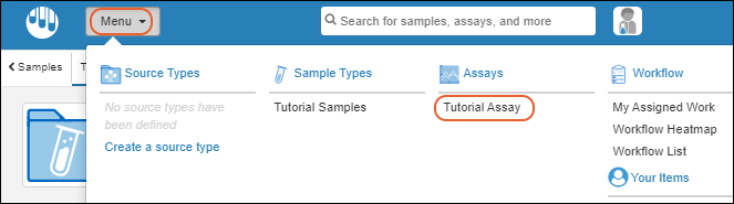 The other way to access assay information is via the main menu in the header to select
