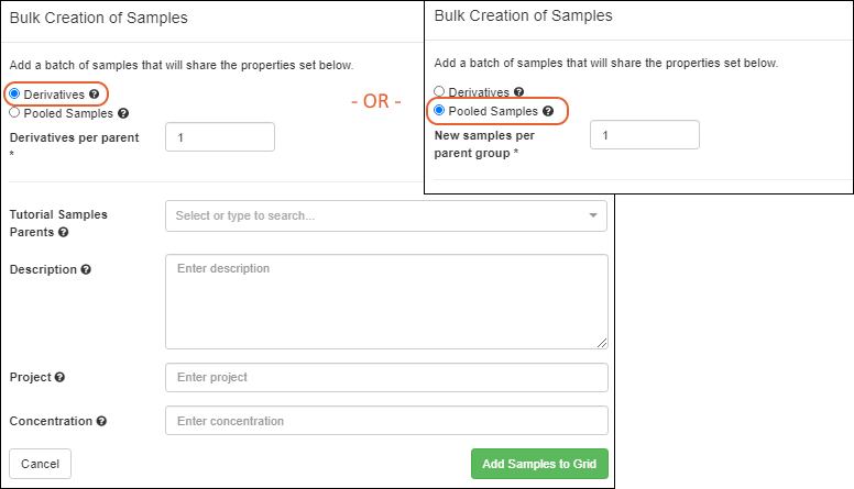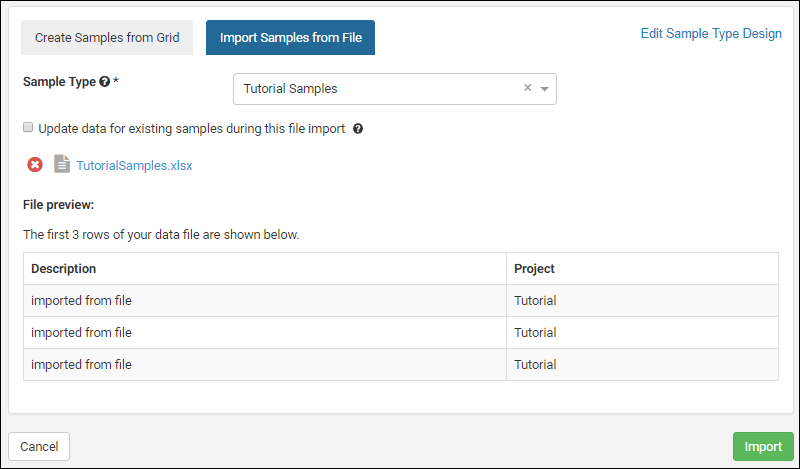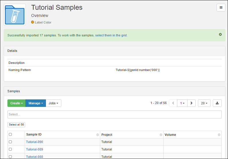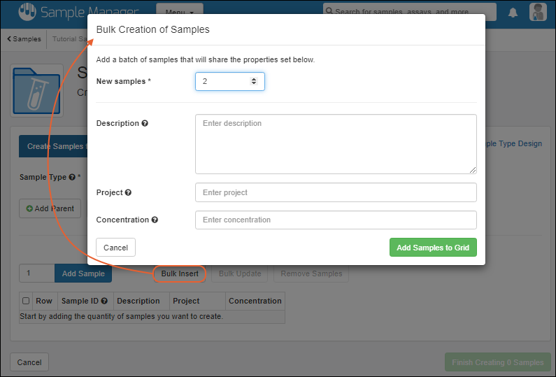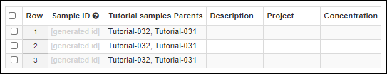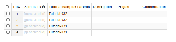 Sample has a unique ID and is a member of one Sample Type. This topic assumes you are starting from an "empty" application and walks you through creating a "Tutorial Samples" type and populating it with a set of samples to use in the next steps.