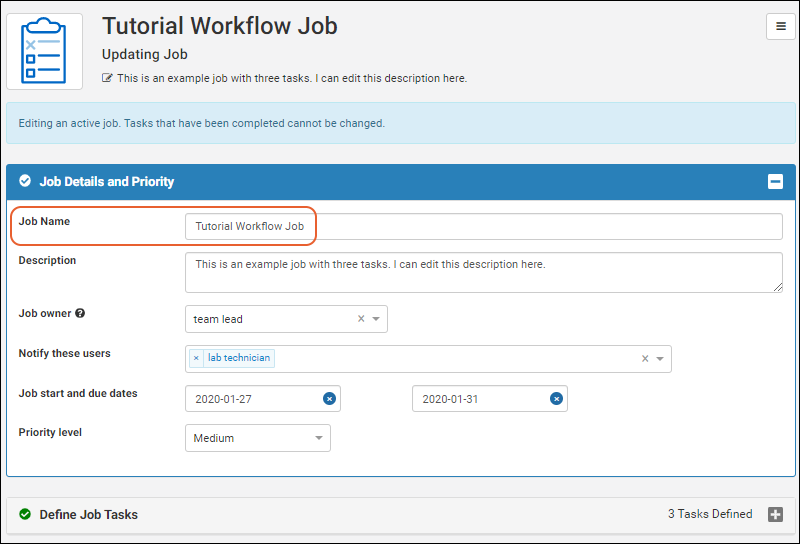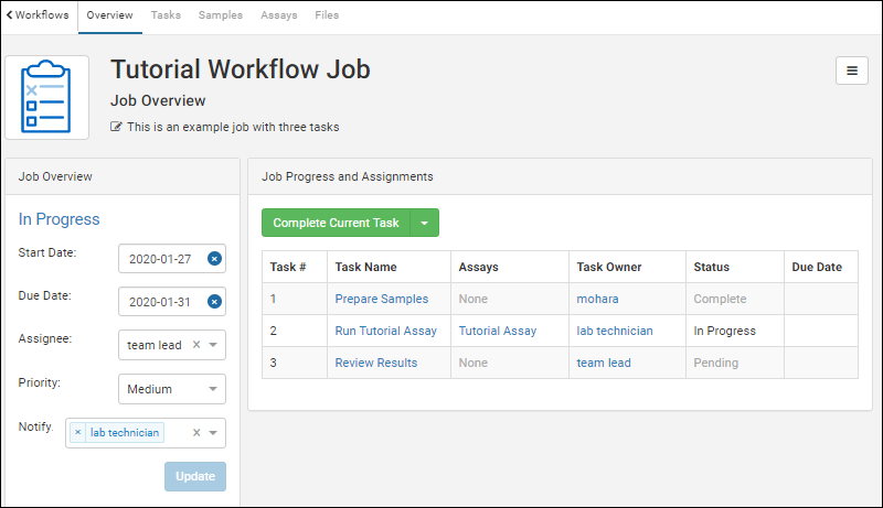 Your laboratory workflow can be managed by creating workflow jobs for the sequences of tasks your team performs. Add your users, set permissions, and organize your jobs and templates following these topics: