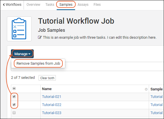 Tasks, Samples, Assays, and Files associated with the job.