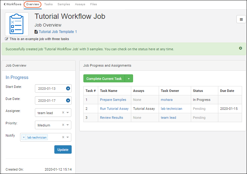 Workflow jobs organize related tasks into a sequence of work to be completed. A set of samples to be worked on can be associated with the job, and it can include direct links to upload data for the necessary assay tests performed on those samples. You can start by selecting samples directly from a grid, or use a