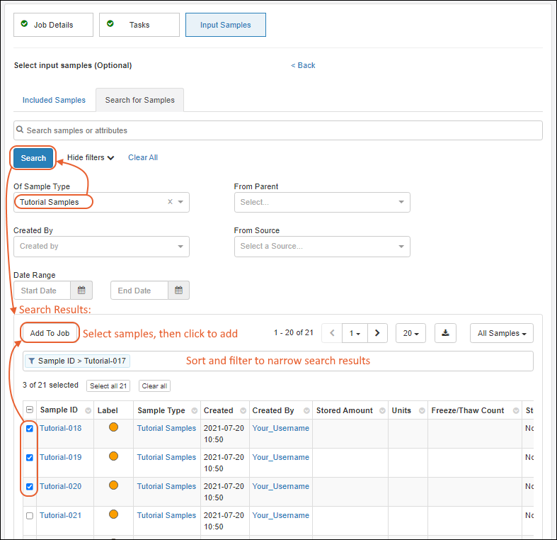 To start a job, you can either start by selecting the samples you want worked on, or add them to the job later. It's also possible to have jobs that do not involve samples, if that supports your lab workflow.