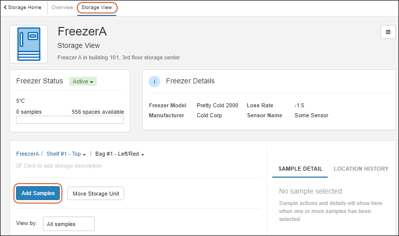 Storage View tab for this freezer, open to the location you selected.