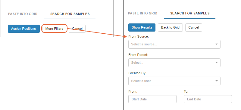 - Use checkboxes to select the samples of interest, then click Assign Positions, or return for More Filters.