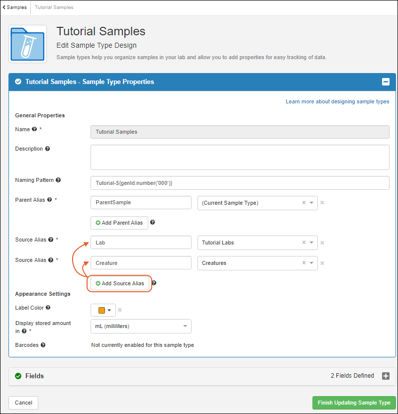 - Click Finish Updating Sample Type.