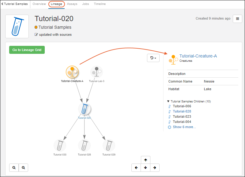 Lineage tab. You'll see a graphical representation of the creature and lab sources for this sample, as well as child samples 'derived' from it.