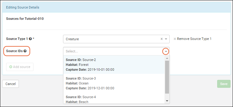 This will add an entry box for Source IDs. Click to select from the menu; type ahead to narrow the choices. You can select more than one source ID for this field.