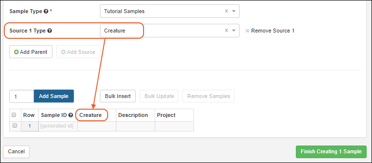 Populate the grid as when creating samples, making use of the bulk insert and update options if appropriate. When you start typing into the source parent field (labelled "Creature Parents" in the above), it will filter a listing of all sources of that type from which you can select one or more.