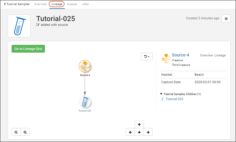 Click the Lineage tab to see that the source is also represented in the lineage grid. Click the node for the source to see if there are other samples derived from that specific source.