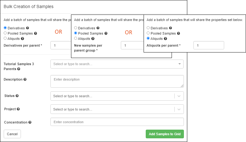 Bulk Insert, you will have an additional selection to make in the bulk creation popup. Choose whether you want to use the parent sample(s) to create: