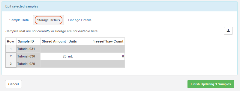 - Note that lineage for aliquots cannot be changed after they are created. Rows for any selected aliquots will be grayed out here.