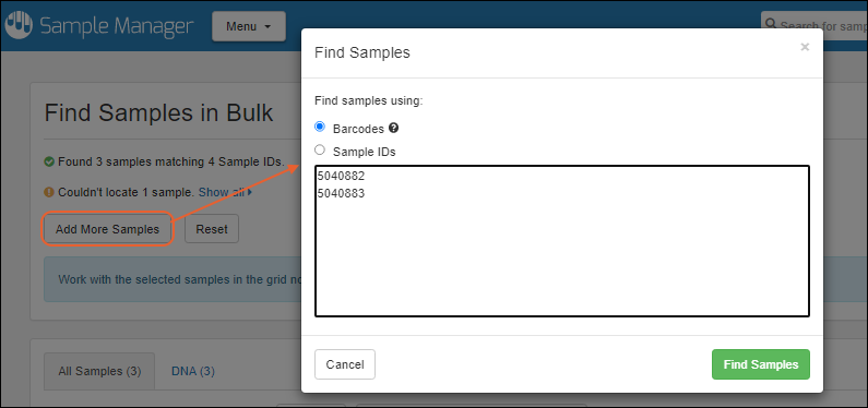 Add More Samples to add to the list. As in the original search, you can input either Barcodes or Sample IDs. This allows you to create a set of results that blend the two search methods.