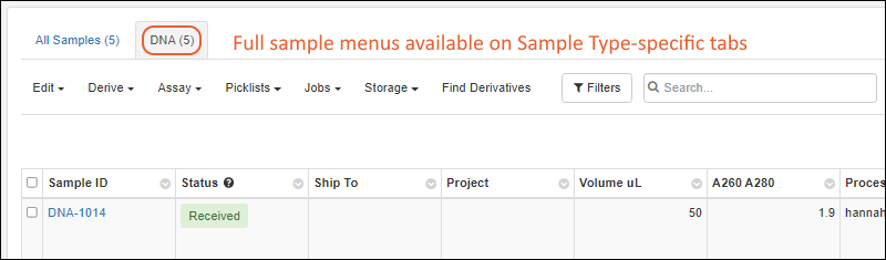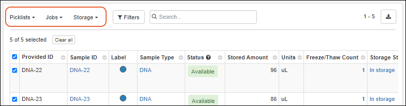 Once you've built your list of Samples in the grid on the search page, you can use the menus for the following actions on the