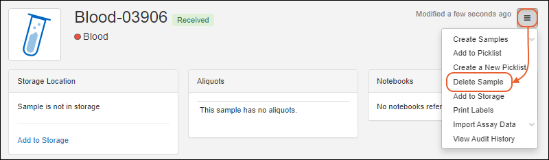 - From the detail page for the sample to delete, open the menu on the right.