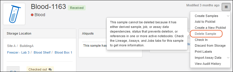 For samples with data dependencies or references, deletion is disallowed. This ensures integrity of your data in that the origins of the data will be retained for future reference. Samples cannot be deleted if they:
