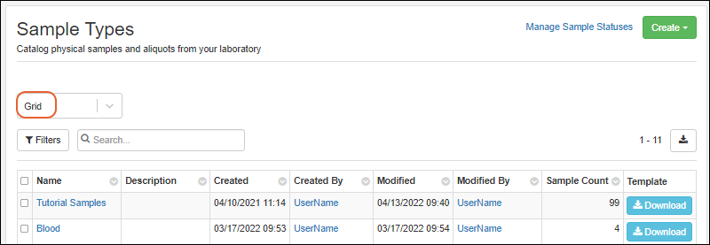 The grid view of all Sample Types lists the name, description, and other details about each type of sample in the system. You can also download a template for easier import of data from files.