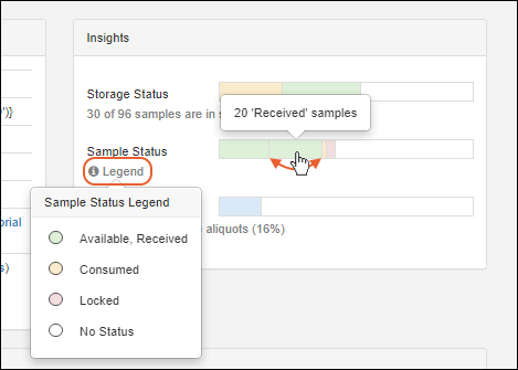 Status values have the same base type, such as "Received" and "Available" both being "Available" samples, you can hover over portions of the bar for details of that specific sample status. Click any bar segment to filter the samples grid to show only those samples.