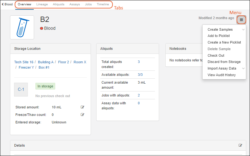 - For an aliquot, you will see both Aliquot Details and Original Sample Details in separate panels.