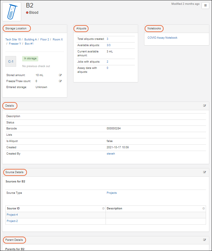 - Aliquots: Details about any aliquots created of this sample.