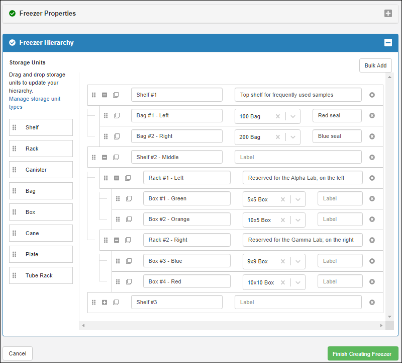 - Once you have completed your storage hierarchy, click Finish Creating Freezer.