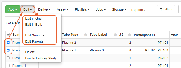 To edit selected samples, select them on a grid or picklist using the checkboxes. If you are viewing a grid that contains samples of several types, you will first need to switch to the tab for the specific sample type before you can edit properties. Once you've selected the samples to edit, use the