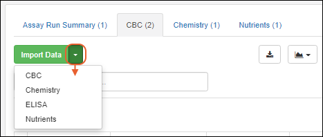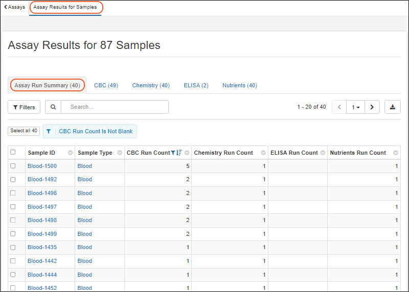 On assay-specific tabs, you can see all the assay results for your selected group of samples.