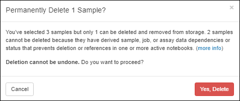 If deletion is disallowed for any of the samples you attempt to delete, the popup will give you more details and ask you to confirm or cancel the partial deletion of any samples without dependencies.