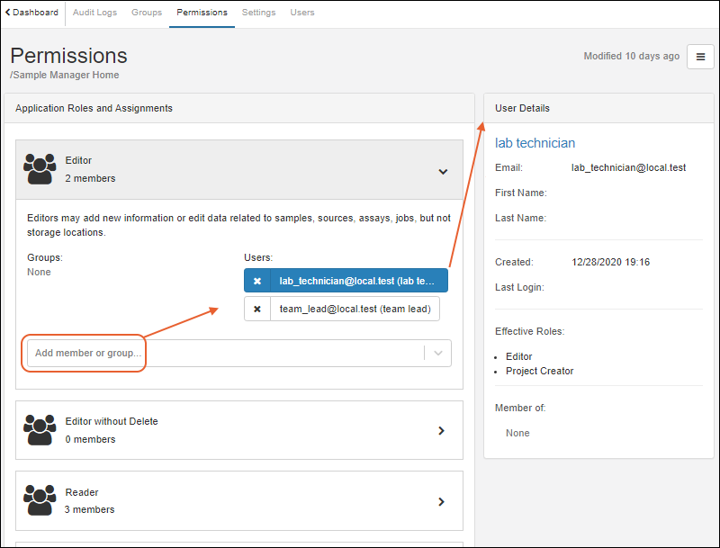 Editors: Have the Readers' access, and can also add new information or edit data related to samples, assays, and jobs.
