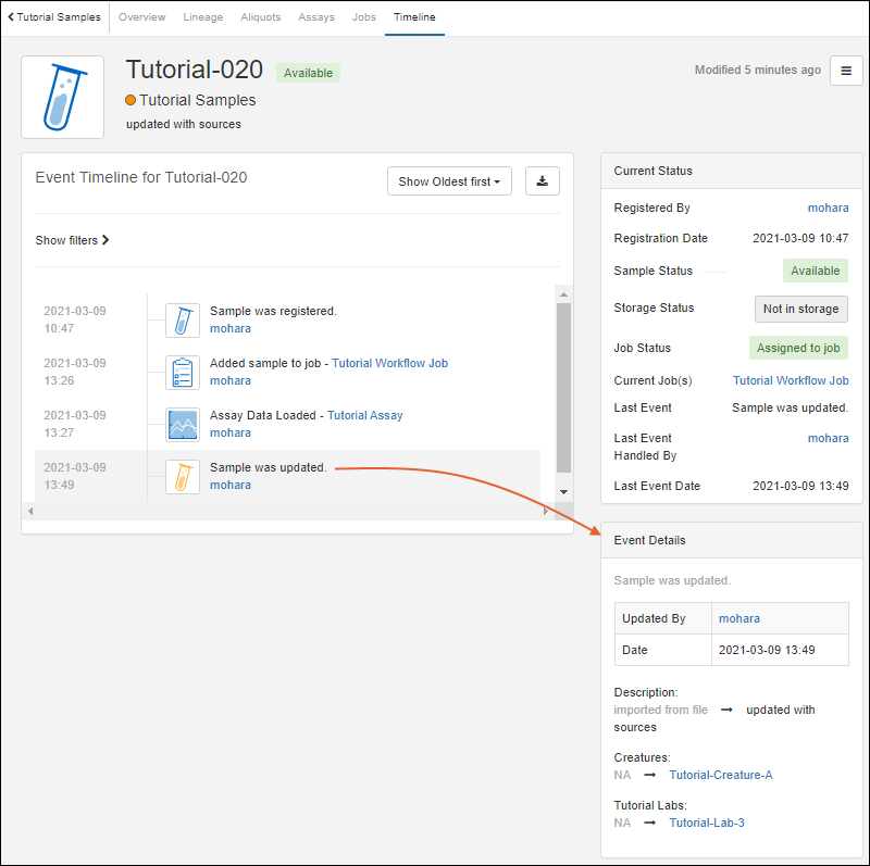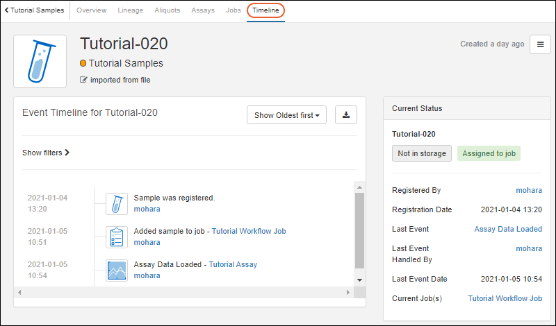 Timeline: a history of events for this sample (so far only registration has occurred)