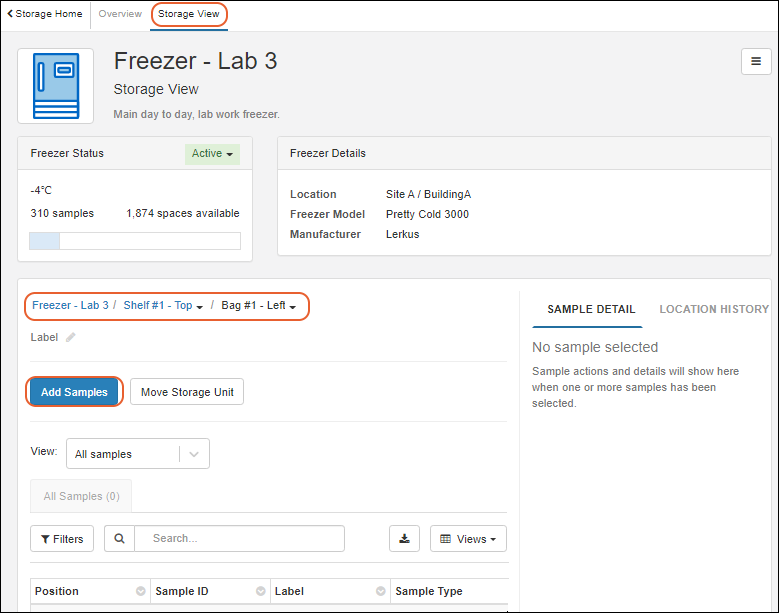 Overview: basic details including the values of all sample properties and fields as well as the storage location (if any)