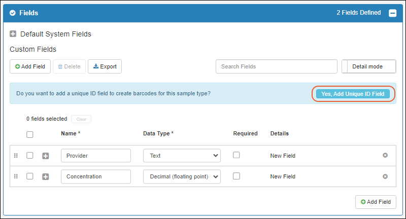 Yes, Add Unique ID Field will add a new field named "Barcode". Every new sample of this type will have a new barcode generated for it.