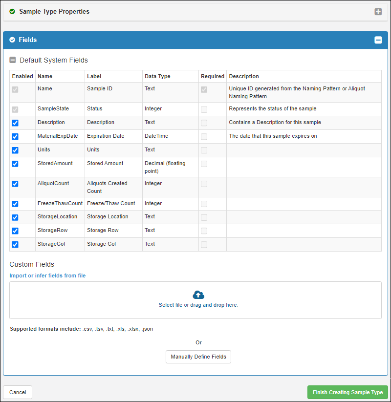 - Before you click Finish Creating Sample Type, determine whether you need to add Fields.
