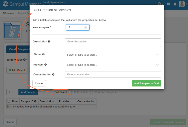 Create Samples From Grid tab gives you several options for entering sample information in the application directly, as opposed to uploading a file of data. You can manually enter values for the fields in a grid format, or use bulk insert and bulk update to streamline entry of similar values.
