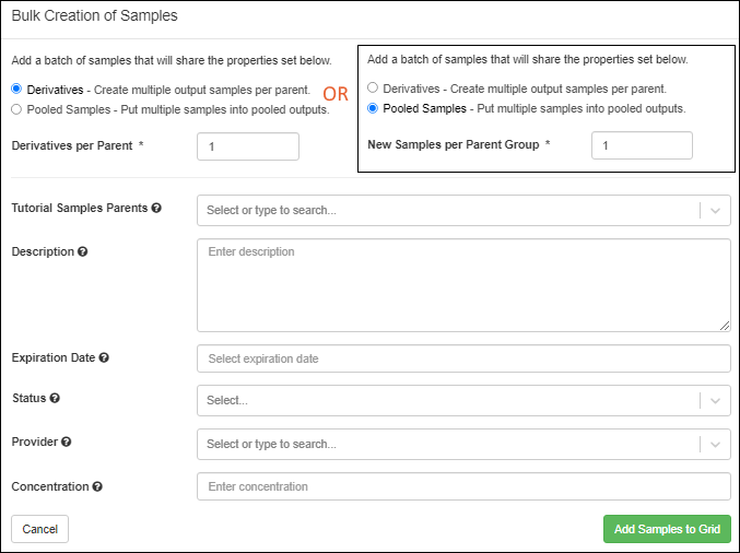 - Pooled Samples, specifying the number of new samples to create for the pooled parent(s).